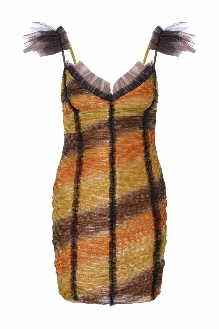 A stretchy metallic plissé mini dress with ruching throughout. Spiky black and taupe tulle tufting appears on the shoulder, along the neckline and down the bodice. Fabricated in a gold-flecked rayon lurex fabric, with abstract yellow, orange and taupe stripes. Made in New York City