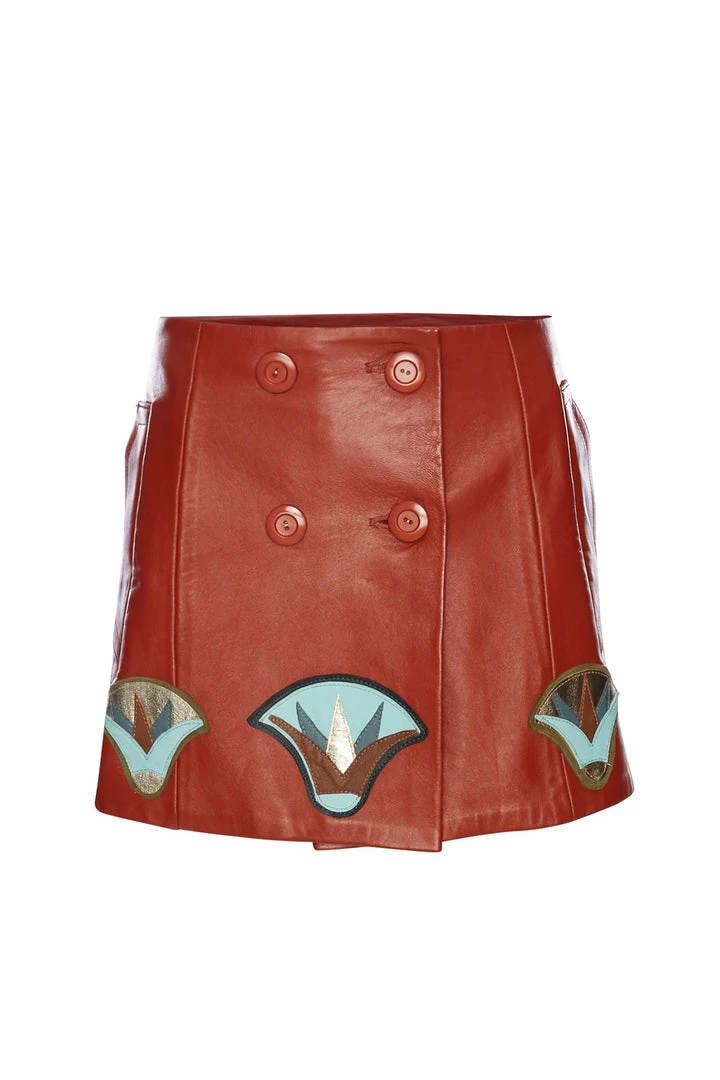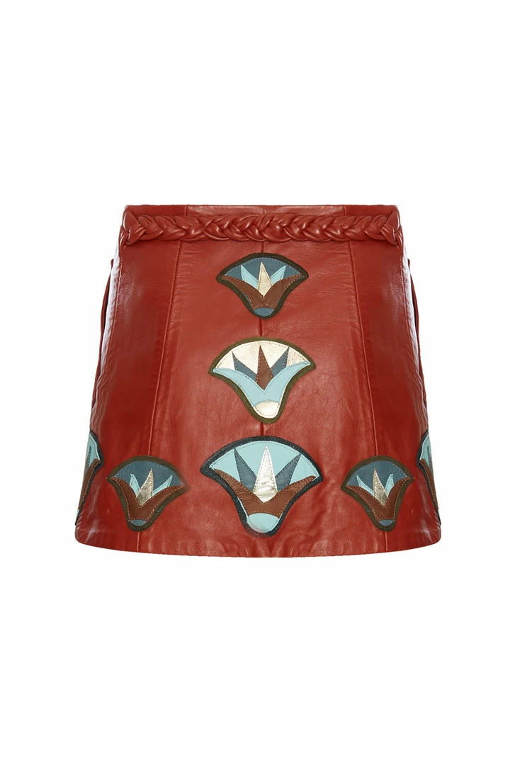 Custom made brown leather mini skirt with lotus flower patches; up cycled and sustainable fashion