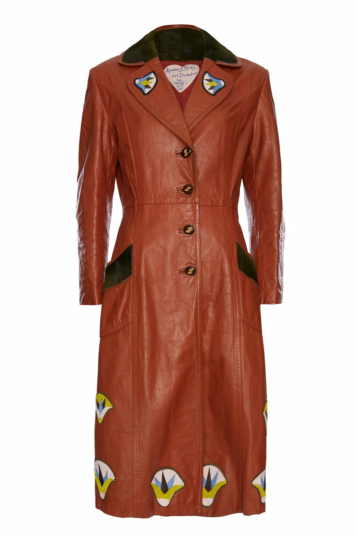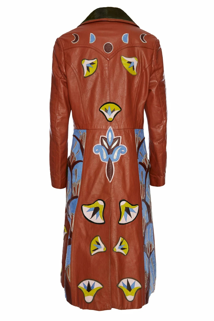 This vintage long leather trench coat has been beautifully enhanced with a fur collar, pockets and embroidered patches, featuring a slit at the back of the jacket.