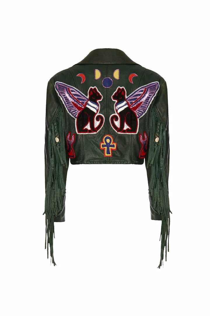Custom hand made jacket with appliqué patches of Egyptian cats; religious symbolism and fringed sleeves; up cycled and sustainable fashion; one-of-a-kind pieceÂ