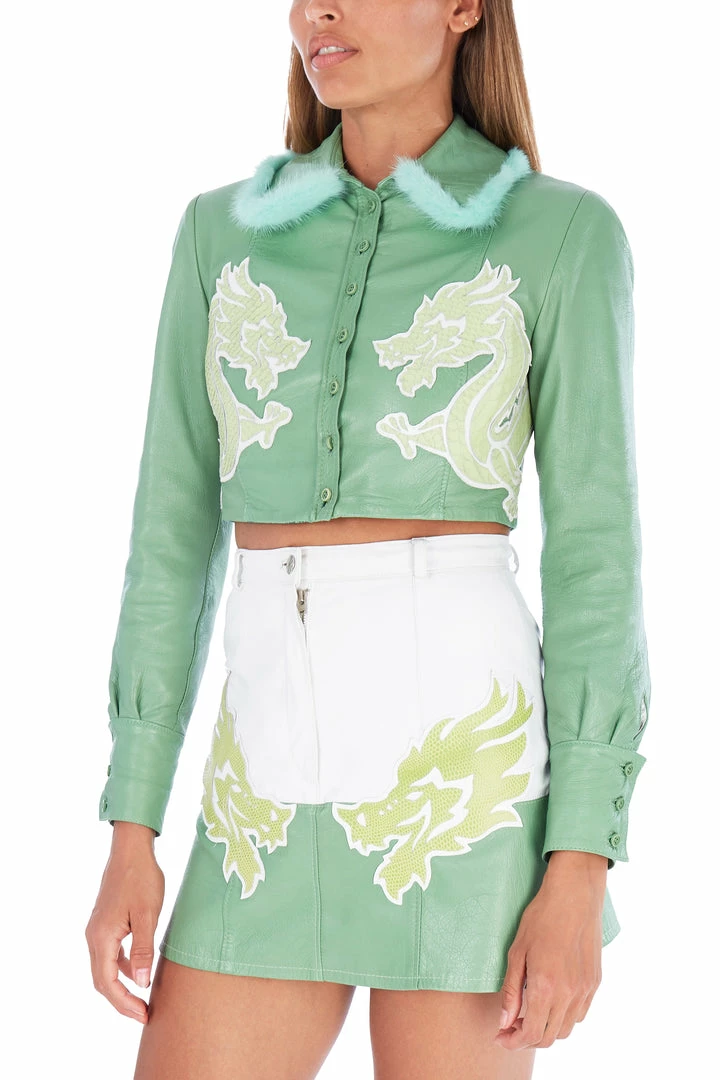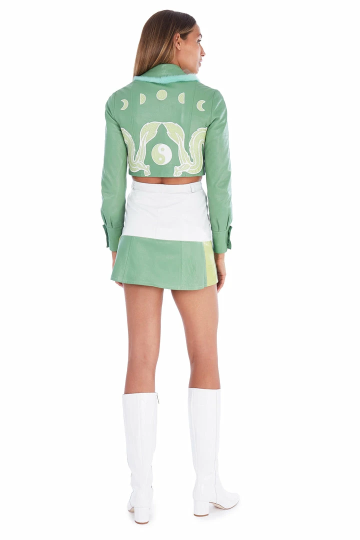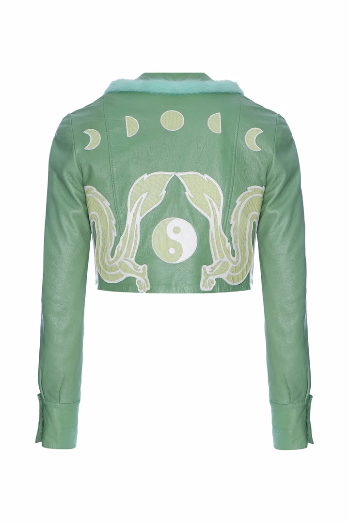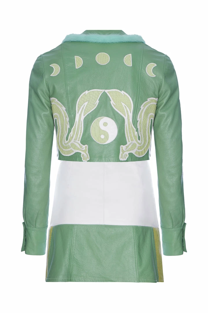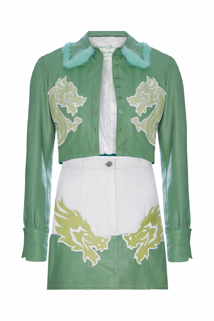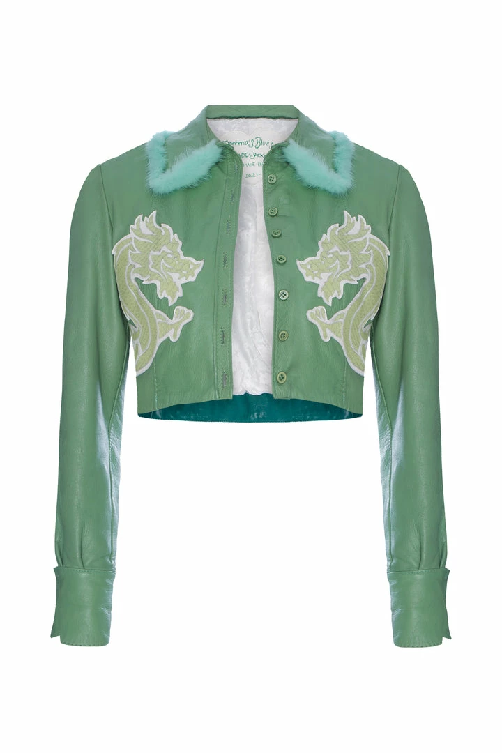 This leather green jacket has been beautifully enhanced with vintage white leather lined detailing at the bottom and sleeves, hand stitched and is truly one of a kind.