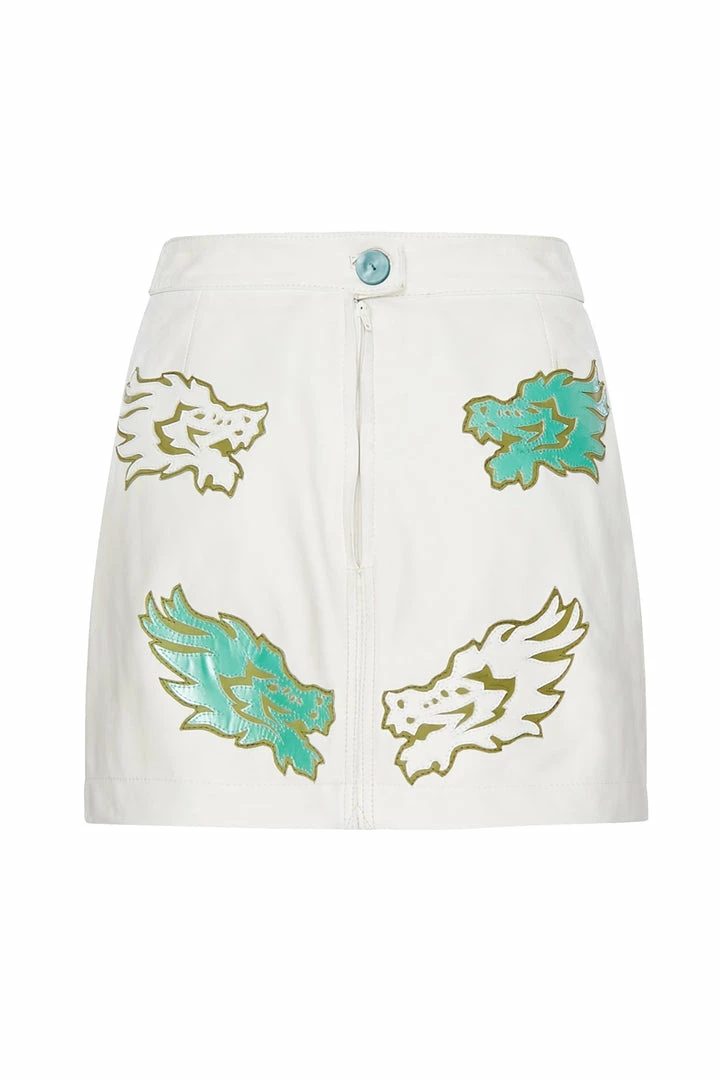 This leather green skirt has been beautifully enhanced with vintage white leather lined detailing, hand stitched and is truly one of a kind.
