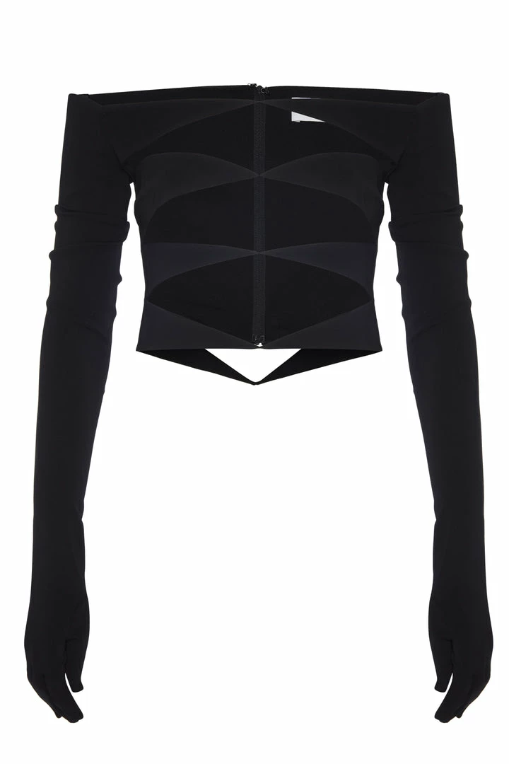 Made from black crepe, this off shoulder cut-out glove top is one that accentuates ones body in the sexiest way possible.