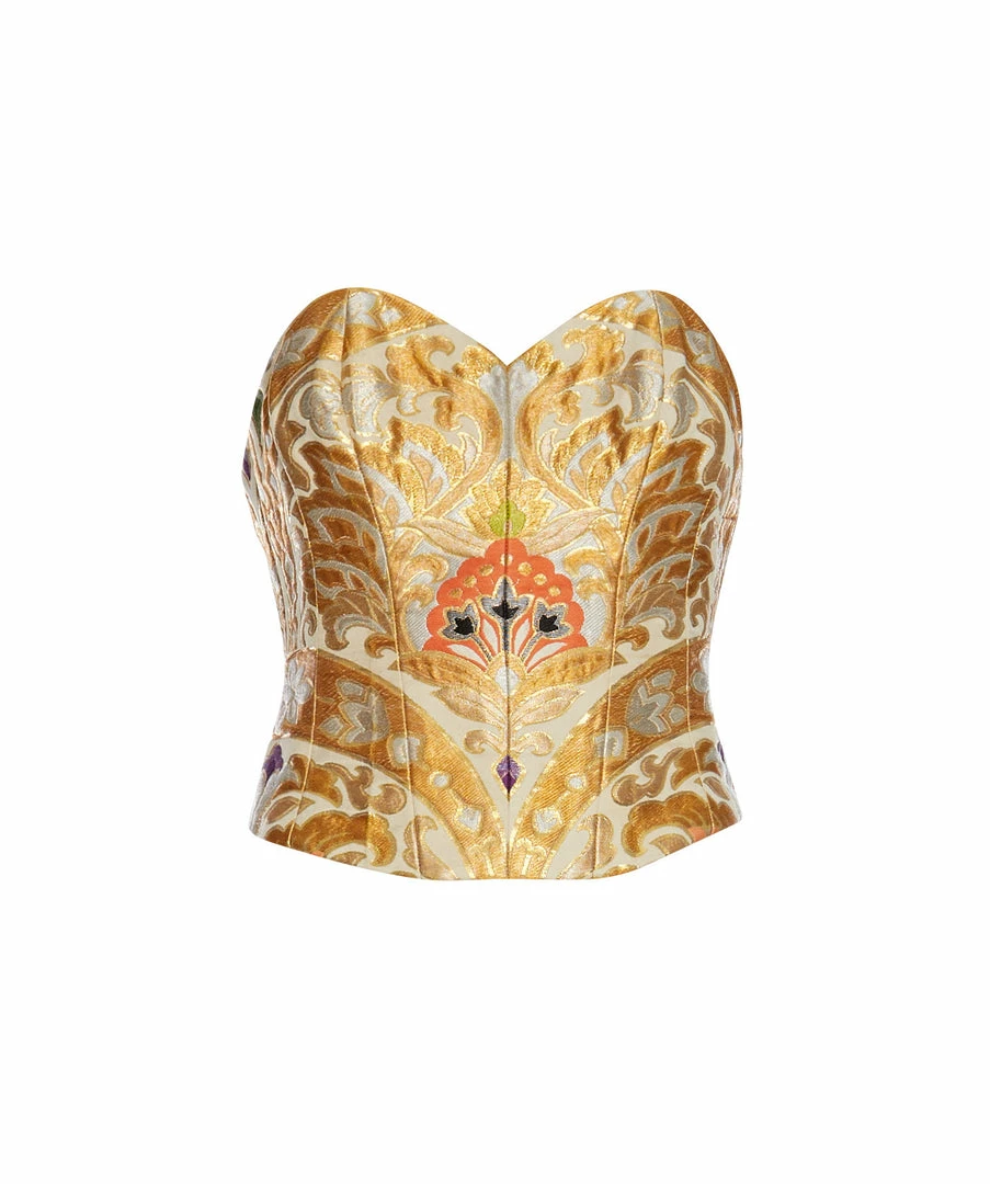 This Corset is a unique piece made from a Japanese Obi coming from Kyoto from the Showa Era. An Obi is a sash or a belt used to hold in place a kimono, a Japanese traditional dress. This particular one is a vintage Maru Obi, the silk is carefully woven on both sides and folded in half.  The fold line of the former Obi is still visible on the Corset. The motif of this Obi consists of two large arabesques grown around two different flowers, one bright orange and the other one with a softer tone of orange, repeated for all the length of the belt.