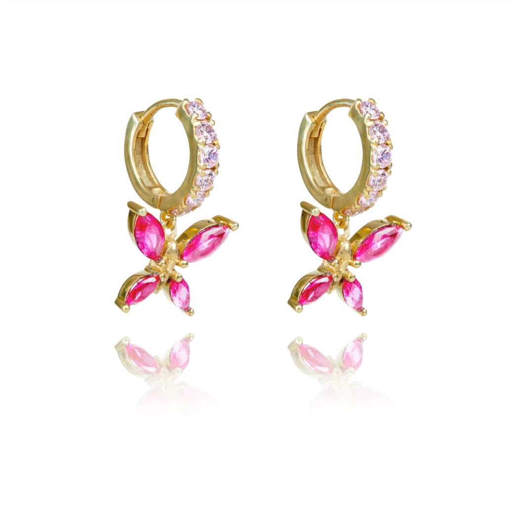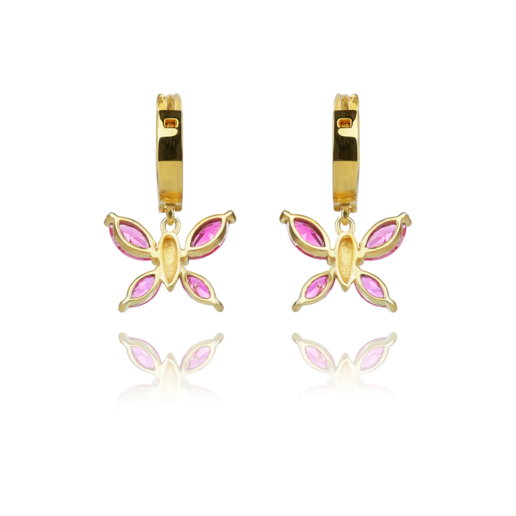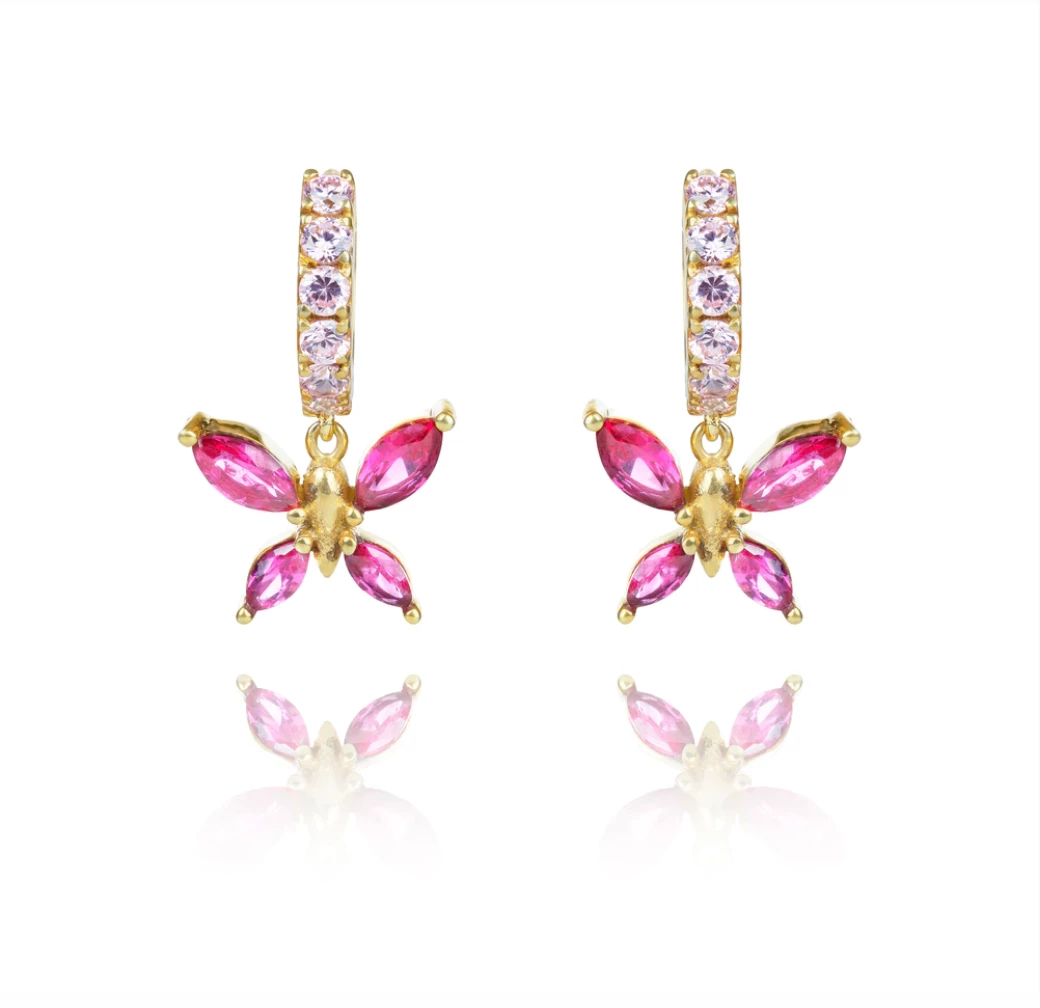Mini huggie hoop earrings with a beautiful hanging marquise shaped butterfly charm, suspended from a hoop embellished with light pink Cubic Zirconia.Â