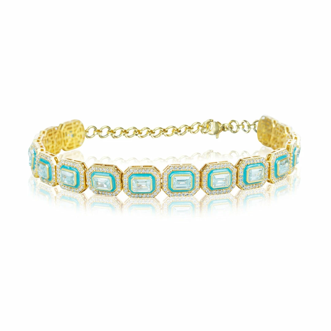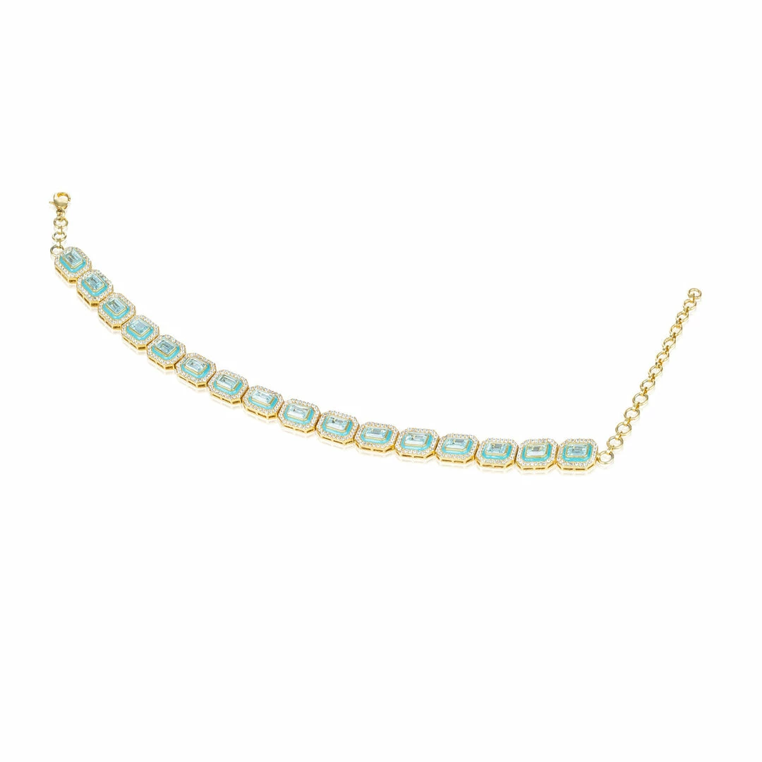 Show-stopping Aquamarine blue gemstone choker with hand painted enamel detail, embellished with Cubic Zirconia to perfection. Bedazzle and make a statement! Complete the look with the matching Malika Studs or the Malika Earrings.