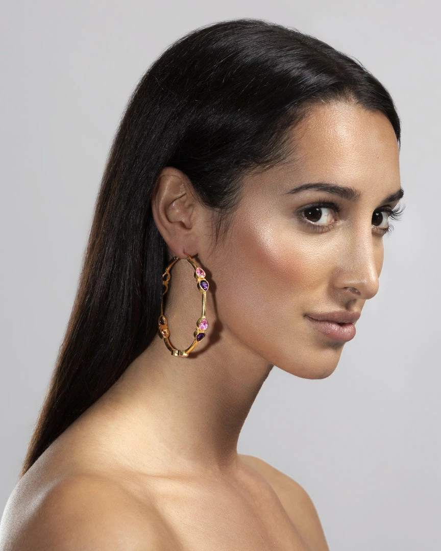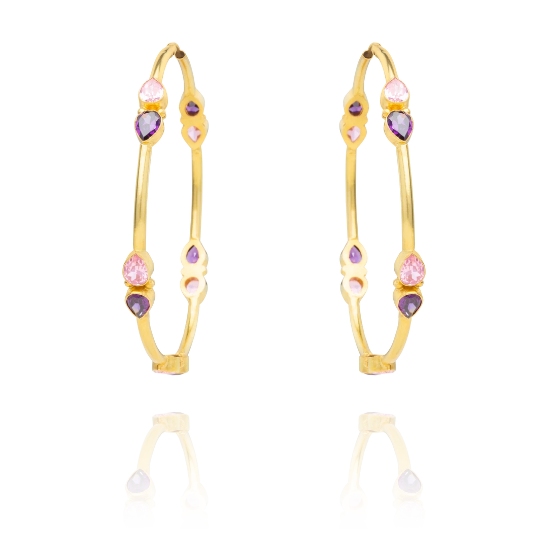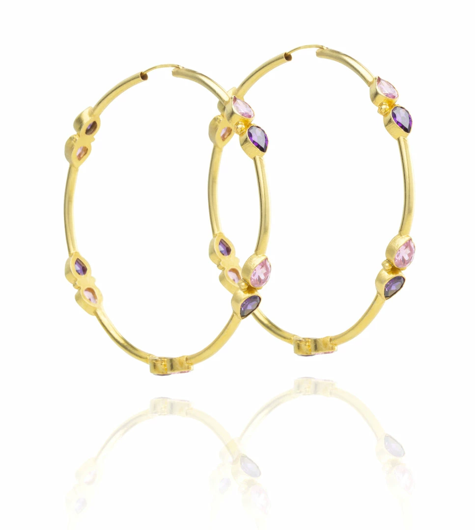 Gold plated statement hoop earrings with pear shaped Amethyst and Rose Quartz CZ.