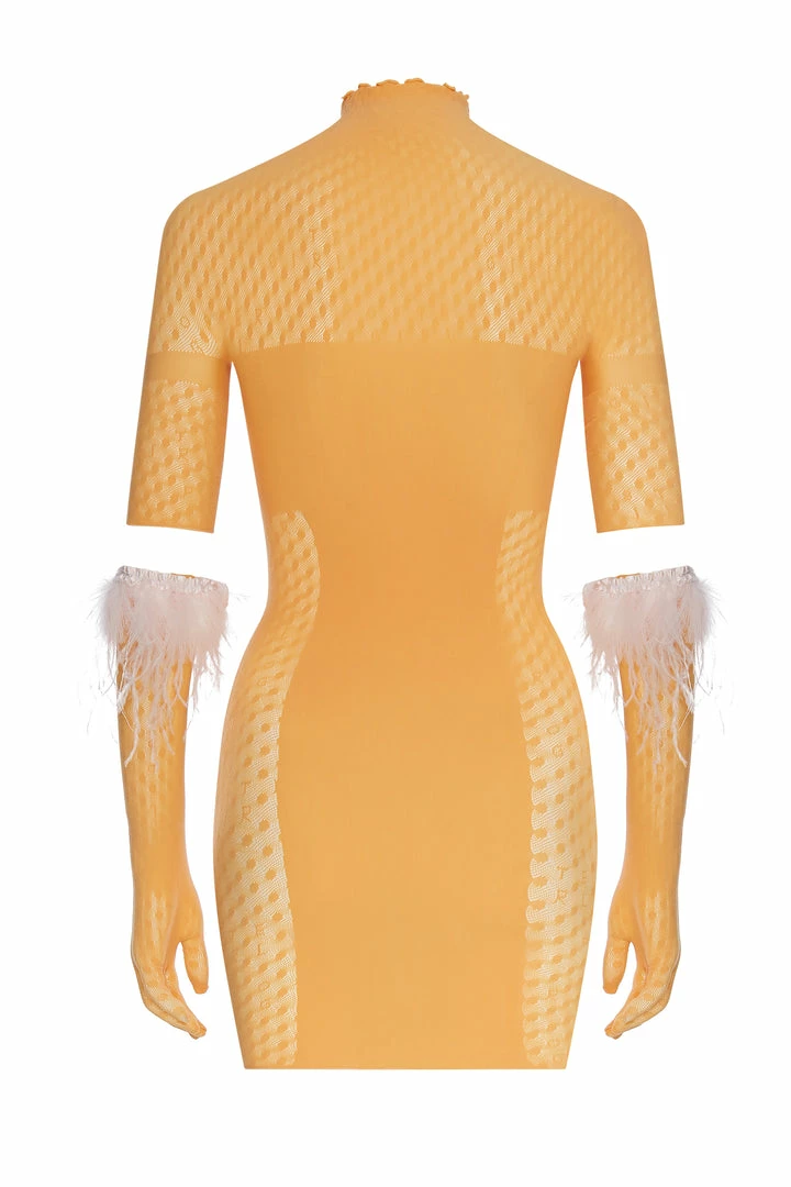 The Pandora Dress is brand new for AW21, POSTER GIRL’s innovative new fishnet shapewear features ‘logo polka dot lace’ and suctions you in all the right places. Multiple cutout crystal heart embellished details in the open-work cut out front with a super soft high neck. The brand’s signature logo is stamped into the lower back.Â