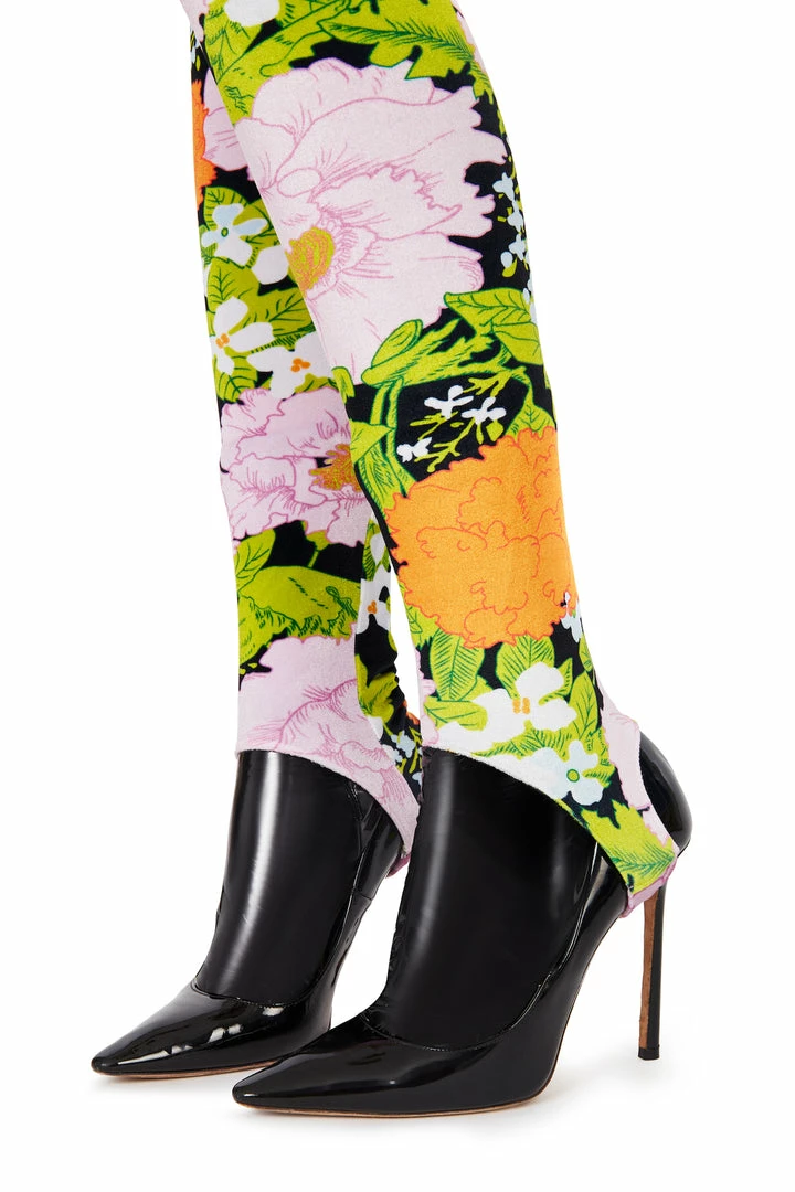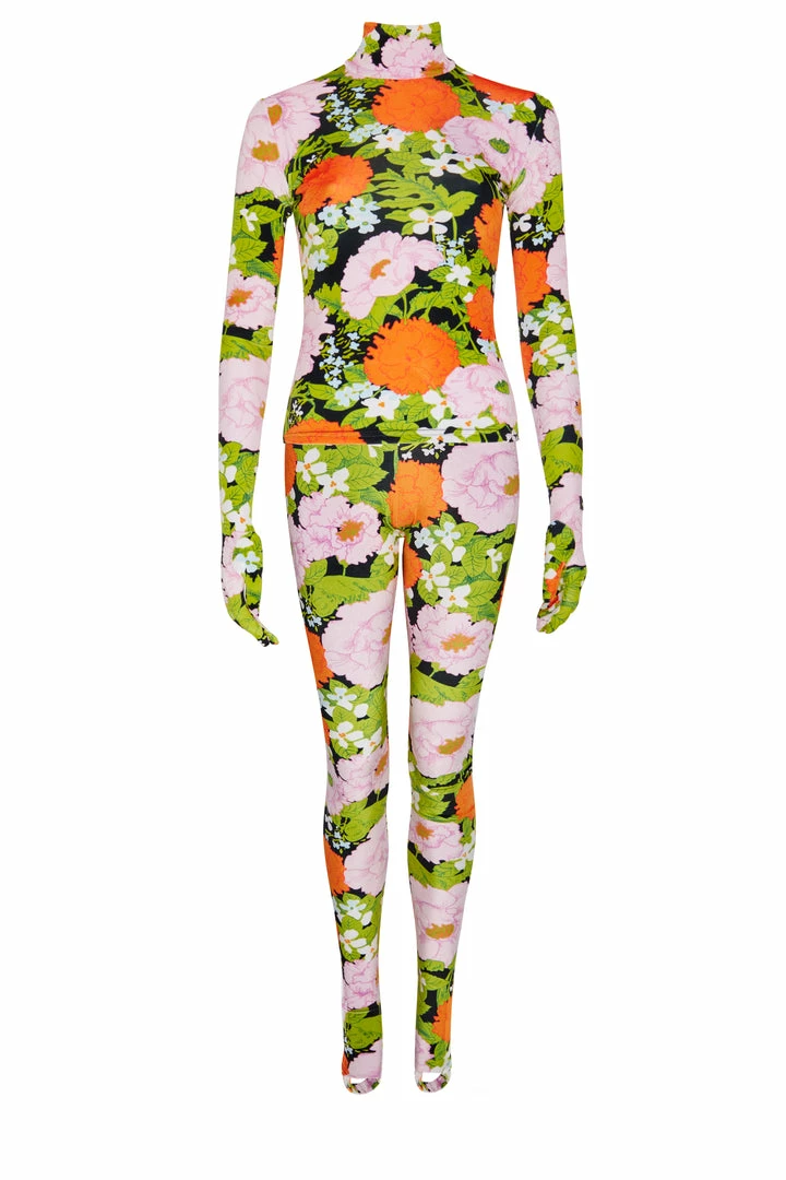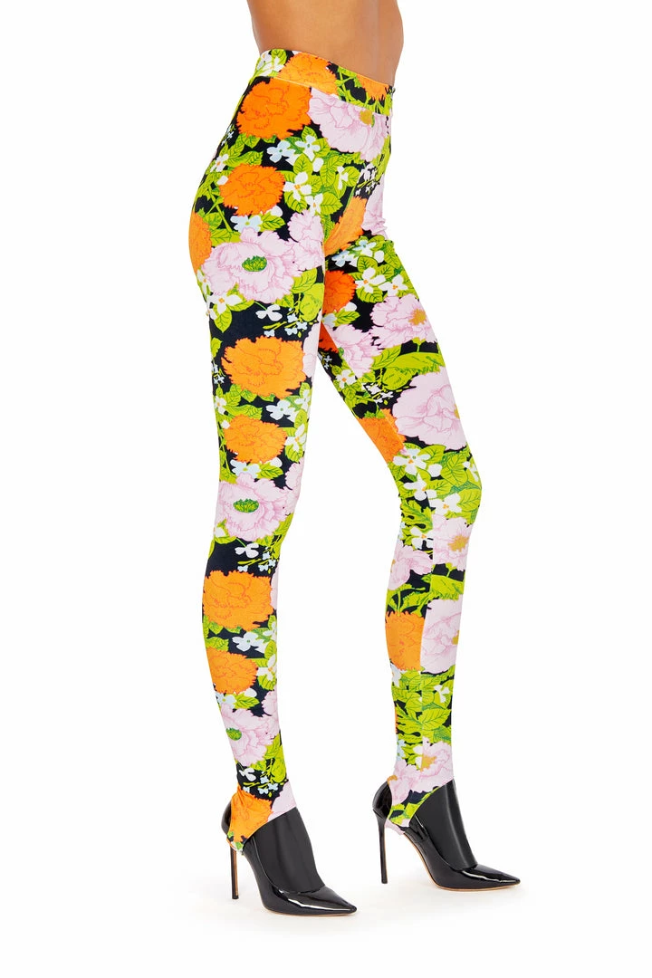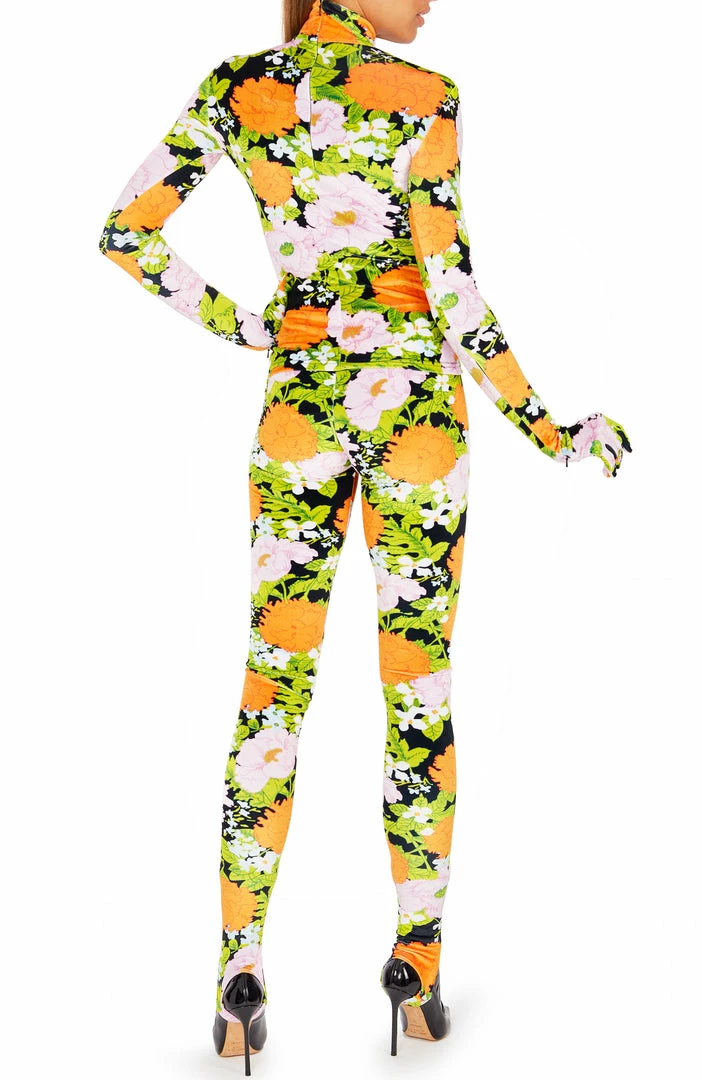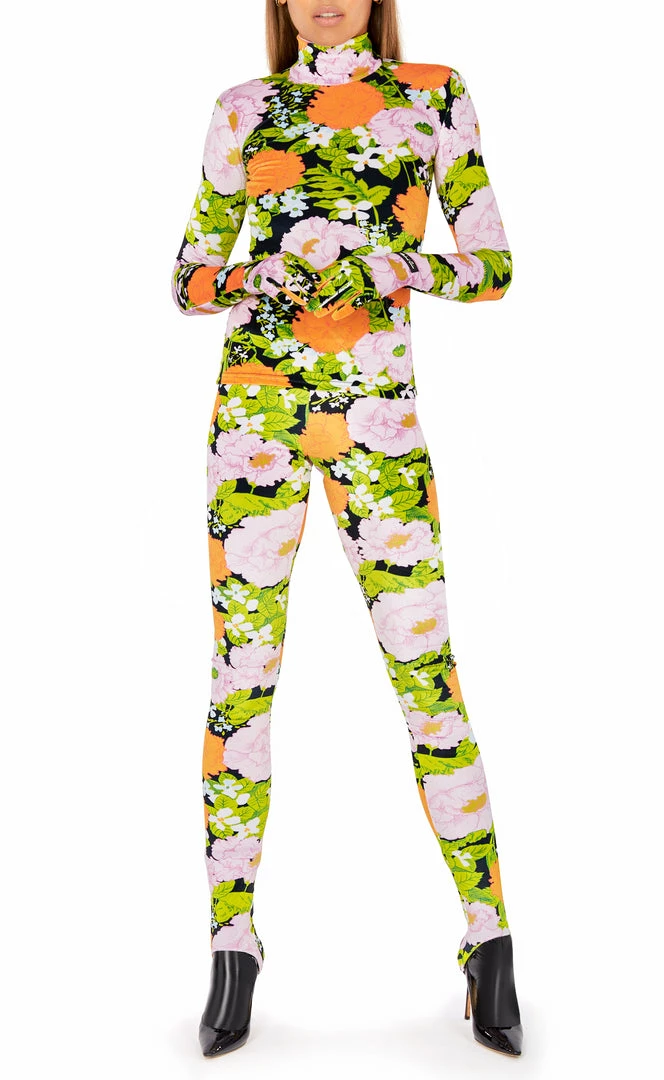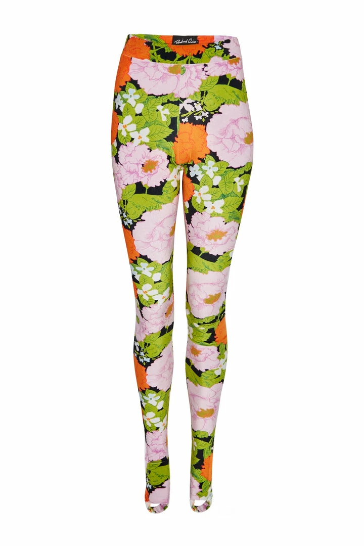 This stretch velour like floral-print orange pastel leggings artfully shaped capturing Richard Quinn’s innovative eye for everyday design.