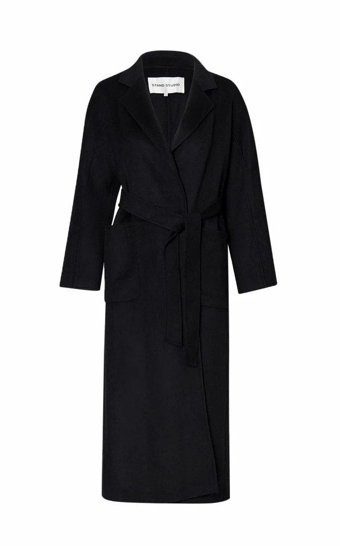Claudine Long Coat is a longer version of the classic Claudine Coat. Claudine Long Coat is made from soft and warm double face wool designed in a wrap silhouette. This style is features large patch pockets in front and a detachable figure-clinching belt.